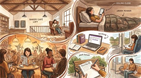Ich möchte mich nicht an einen bestimmten Ort zum Lesen und Schreiben gebunden fühlen. Ich möchte überall lesen und schreiben können. Überall dort, wo es objektiv möglich ist.
