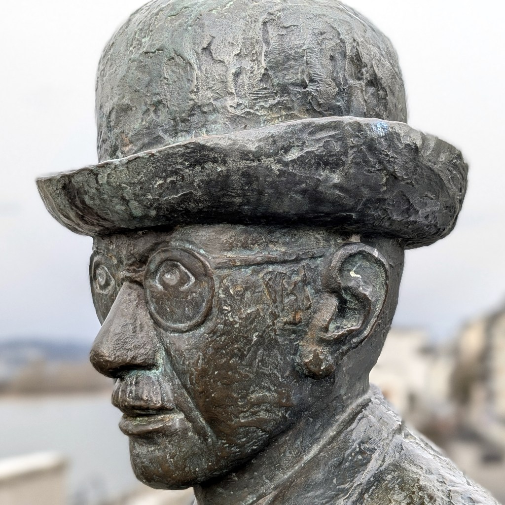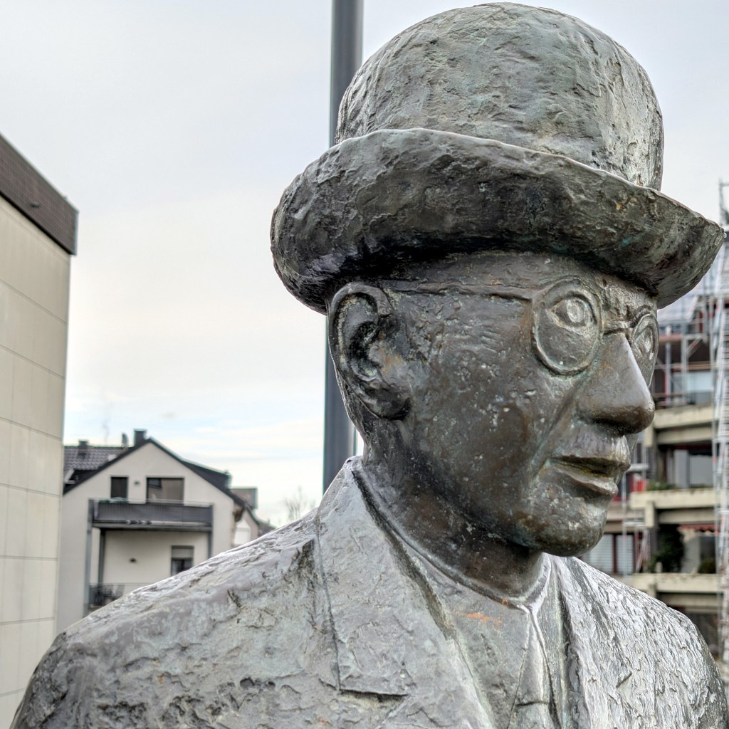 Mein Spaziergang führte mich heute in die entgegengesetzte Richtung: an der Feuerwehr und einem Industriegebiet vorbei und am Rhein entlang zurück. Auf dem Rückweg kehrte ich wieder in das Bäckerei-Café ein, trank einen großen Café Crema, aß einen Laugenkürbisring (vermutlich vom Montag) und las in dem Nachrichtenmagazin „Hintergrund“.