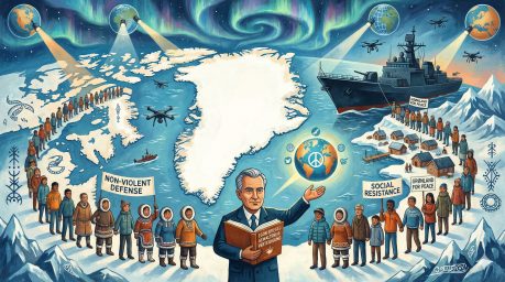 In seinem Artikel untersucht Egon Spiegel, wie sich Grönland hypothetisch mit gewaltfreier, sozialer Verteidigung gegen eine militärische Besetzung durch die USA zur Wehr setzen könnte. Der Autor betont die Bedeutung von gewaltfreiem Widerstand, Nichtkooperation und internationaler Delegitimierung des Aggressors anstelle militärischer Strategien. Grönlands starke soziale Netzwerke, kulturelle Identität und internationale Sichtbarkeit bieten spezifische Vorteile für einen solchen Widerstand. Abschließend werden die Voraussetzungen, Risiken und strategischen Herausforderungen dieser Verteidigungsform erörtert. Dabei wird betont, dass gewaltfreie Verteidigung eine legitime und wirksame Alternative zur militärischen Logik darstellt.